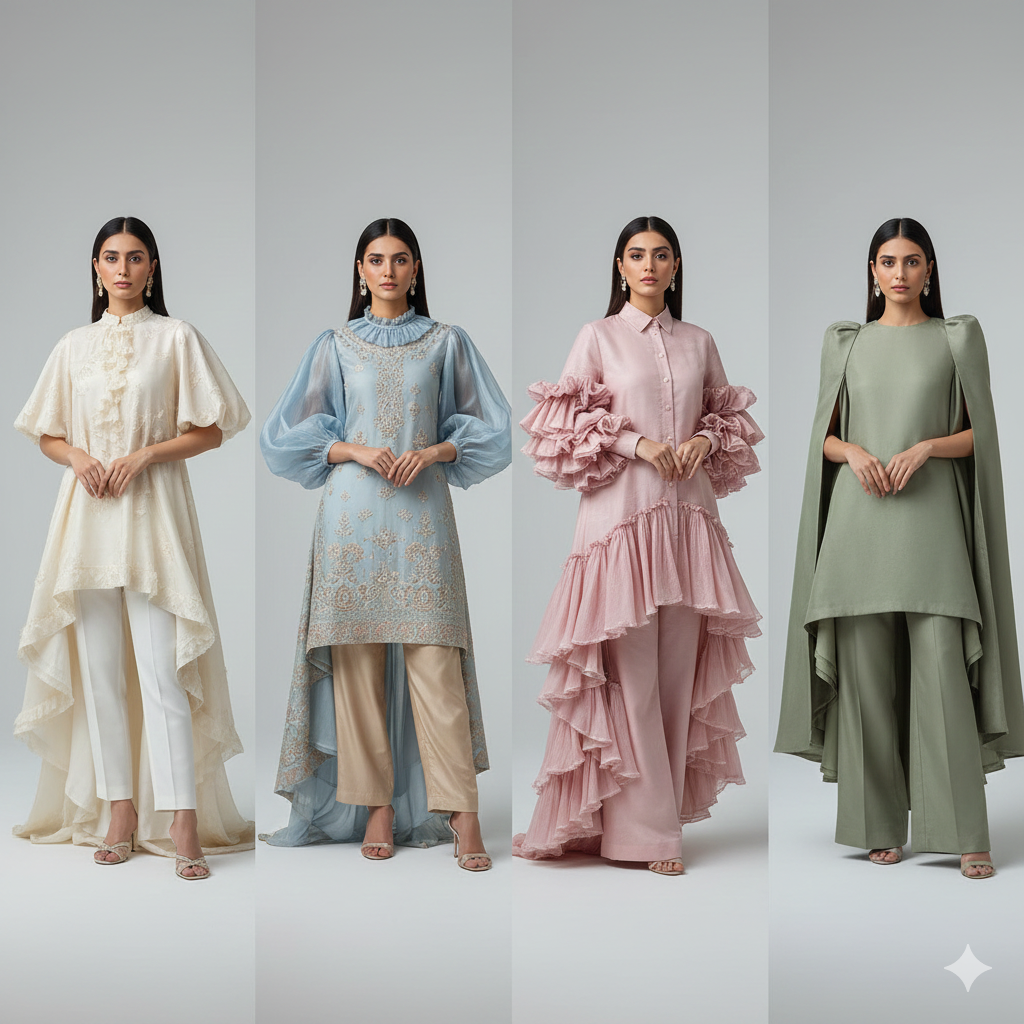 Statement sleeves and unique silhouettes are key fashion trends in Pakistan 2025.